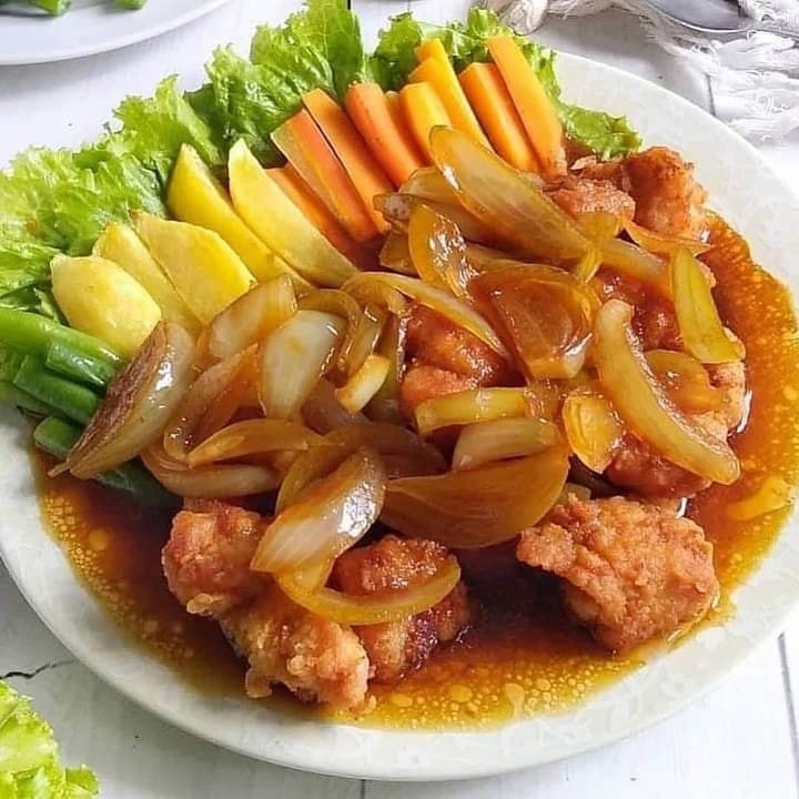 Bahan 500 gram fillet ayam cuci bersih potong kecil lumuri dengan jeruk nipis dan bilas kembali. 2 buah kentang potong wedges, goreng dan sisihkan. 2 buah wortel iris memanjang, rebus dan sisihkan. 150 gram buncis potong pendek, rebus dan sisihkan. . Bumbu marinasi ayam (diamkan selama 1 jam) 1 sdt bawang putih bubuk 1 sdt lada bubuk 4 sdm tepung bumbu serbaguna 2 bungkus tepung bumbu serbaguna 1 buah bawang bombay iris Bahan saos 1 sdm saus tiram 3 sdm kecap manis 1 sdm kecap asin 2 sdm saus tomat 1/2 sdt lada bubuk 1/2 sdt bawang putih bubuk 1/2 sdt kaldu bubuk 150 ml Air matang Cara masak Marinasi ayam dengan bumbu diamkan 1 jam agar meresap sempurna. Dalam wadah masukkan tepung bumbu serbaguna. Ambil ayam yang telah dimarinasi kemudian gulingkan ke tepung bumbu lakukan sampai habis. Goreng ayam sampai kecoklatan angkat dan sisihkan. Tumis bombay sampai wangi. Masukkan bahan saus aduk rata. Tuang air biarkan mendidih. Koreksi rasa dan tuang saus ke atas ayam yang telah di goreng. Sajikan bistik bersama kentang goreng, buncis dan wortel rebus Lihat Lebih Sedikit
