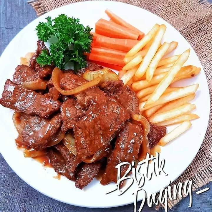 Bahan : 250 gr daging sapi has dalam 1/2 buah bawang bombay, iris tipis memanjang 1/2 sdm maizena Bumbu perendam : 2 siung bawang putih, haluskan 1 sdt saus inggris 2 sdm kecap manis 1 sdm saus tomat 1 sdm kecap asin 1/4 sdt lada Pelengkap : Kentang goreng Sayur rebus Cara memasak : 1. Iris tipis daging sapi melawan serat. Campur dengan bumbu perendam lalu aduk rata. Tutup rapat, diamkan semalaman dikulkas. 2. Sesaat sebelum dimasak, taburi tepung maizena lalu aduk rata. 3. Panaskan 1 sdm minyak goreng, masukkan daging dan bawang bombay, masak hingga daging matang. Tata di piring saji 4. Masak sisa bumbu rendaman daging, tambahkan sedikit air (bisa tambah sedikit garam jika dirasa kurang asin) Aduk hingga mendidih dan mengental. Siramkan ke atas daging. Sajikan bersama kentang goreng dan sayur rebus. Note : Jika ingin bistik lebih berkuah, jumlah bumbu perendam nya bisa di dobel jumlah nyaa yaa. Lihat Lebih Sedikit