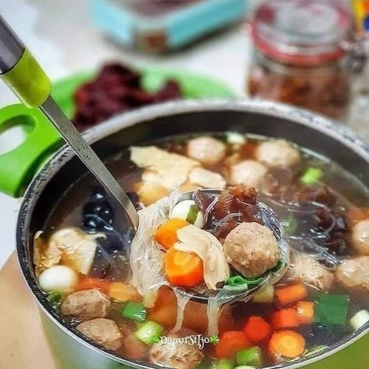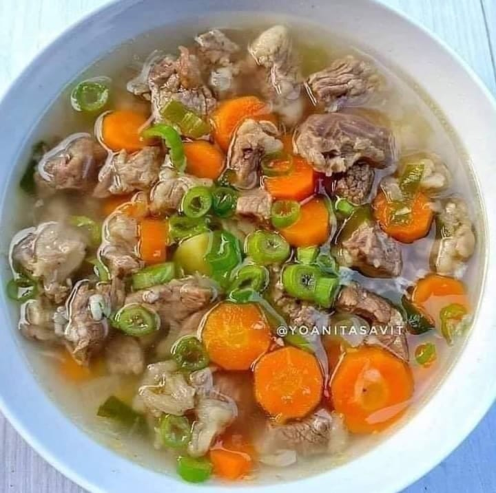 Bahan : 600 gram daging sapi berlemak, potong kotak kecil, cuci bersih Tulangan sapi secukupnya, cuci bersih 3 liter air 4 buah wortel, potong2 1 buah kentang, potong2 1 batang daun bawang, iris Garam, lada, kaldu bubuk secukupnya . Bumbu rempah : 1 buah bunga pekak 2 batang kayu manis uk kecil 2 buah cengkeh 1 jempol jahe, geprek . Bumbu halus : 10 buah bawang merah 10 siung bawang putih . Cara buat : 1. Rebus daging sapi dan tulangan sapi selama 15 menit, lalu cuci bersih daging dan buang air bekas rebusan pertama gunanya agar kotoran dan air darah tidak ikut termasak 2. Siapkan 3 liter air, Rebus daging sapi dan tulangan sapi bersama bumbu rempah hingga empuk (me : pakai panci presto) 3. Tumis bumbu halus dgn sedikit minyak hingga harum. Masukan bumbu tumisan ke dalam panci berisi daging 4. Masukan wortel, kentang, garam, lada, kaldu bubuk masak hingga sayuran empuk. Koreksi rasa. Sesaat sebelum di angkat taburi daun bawang. Sajikan .